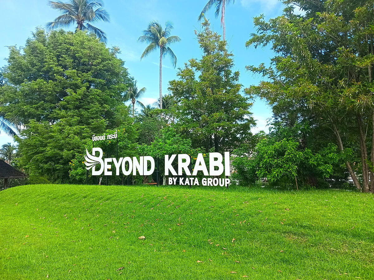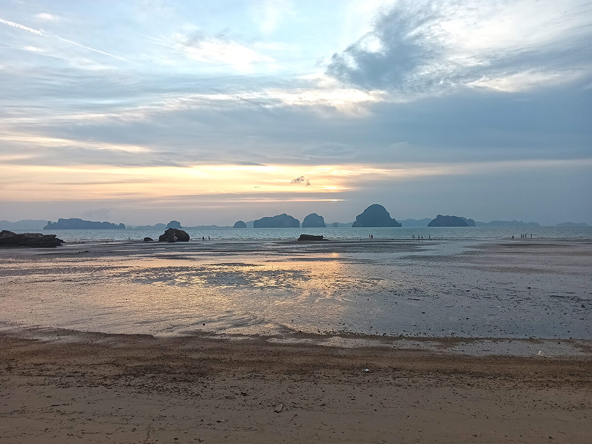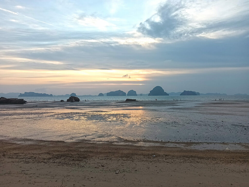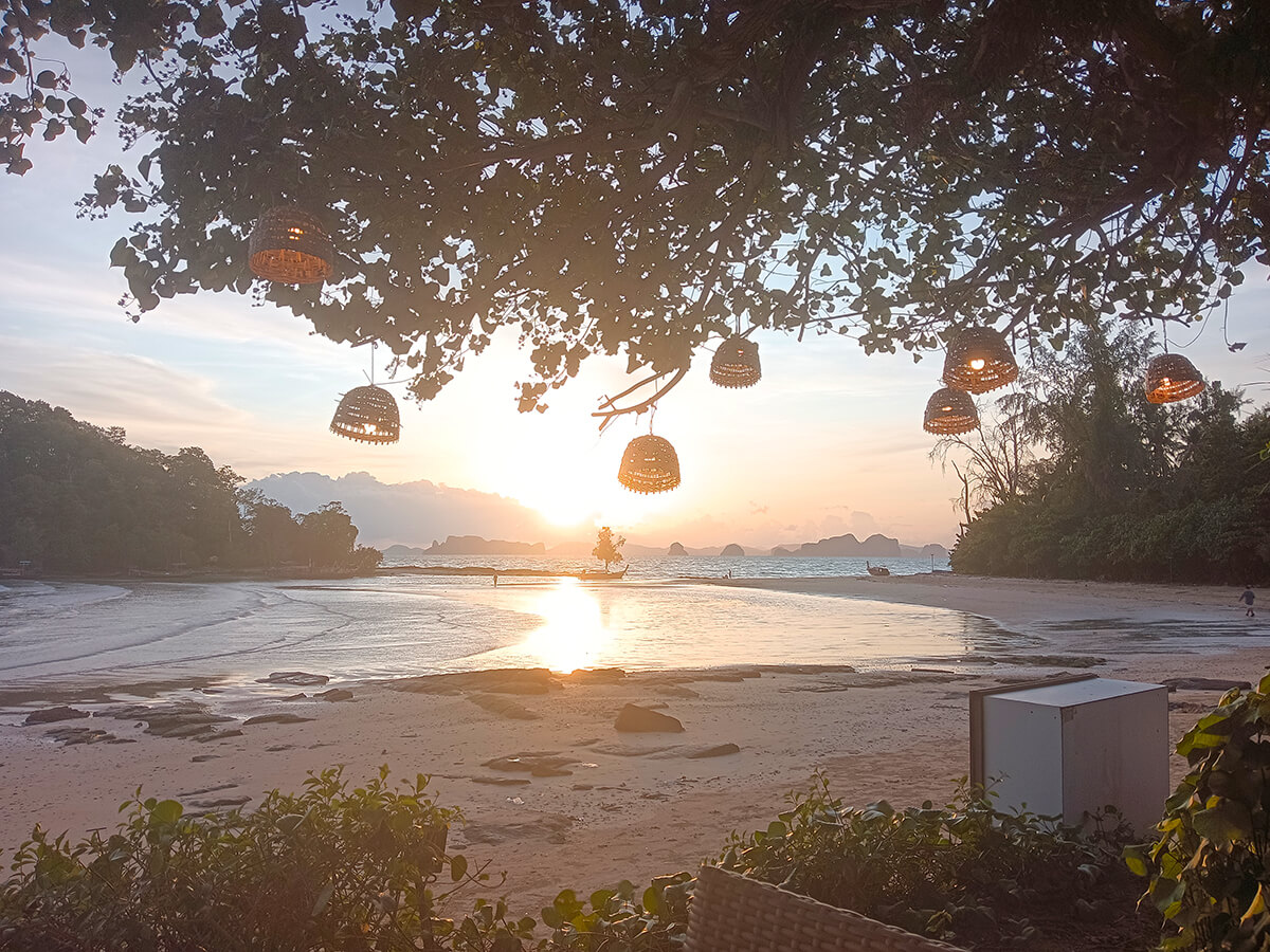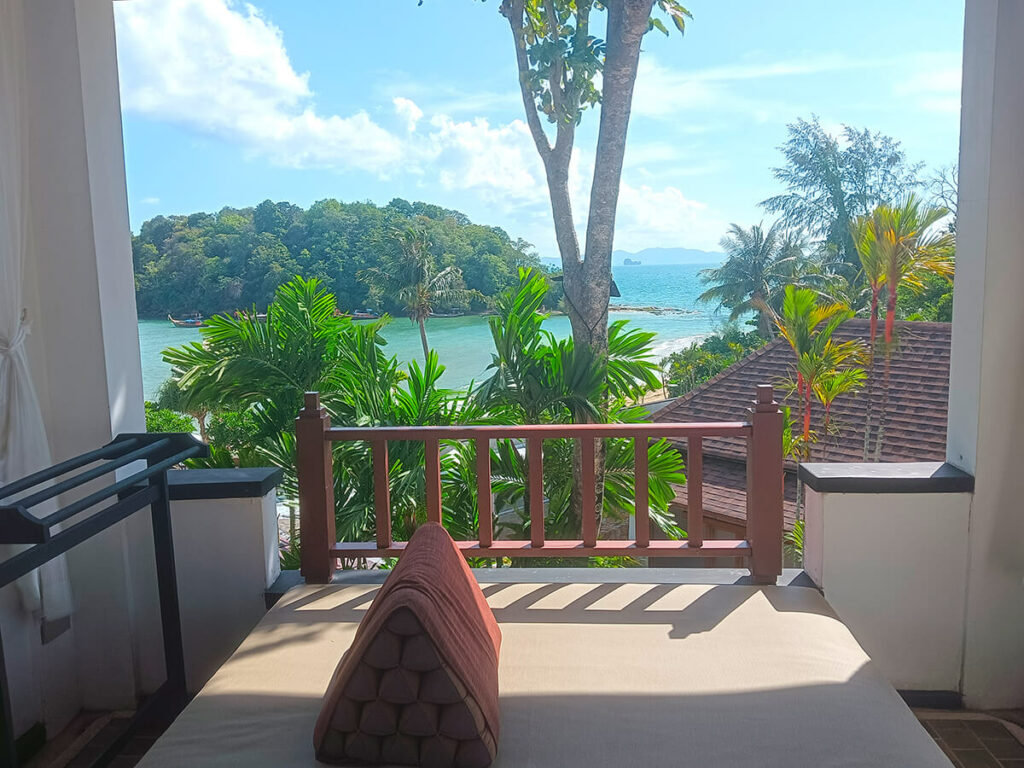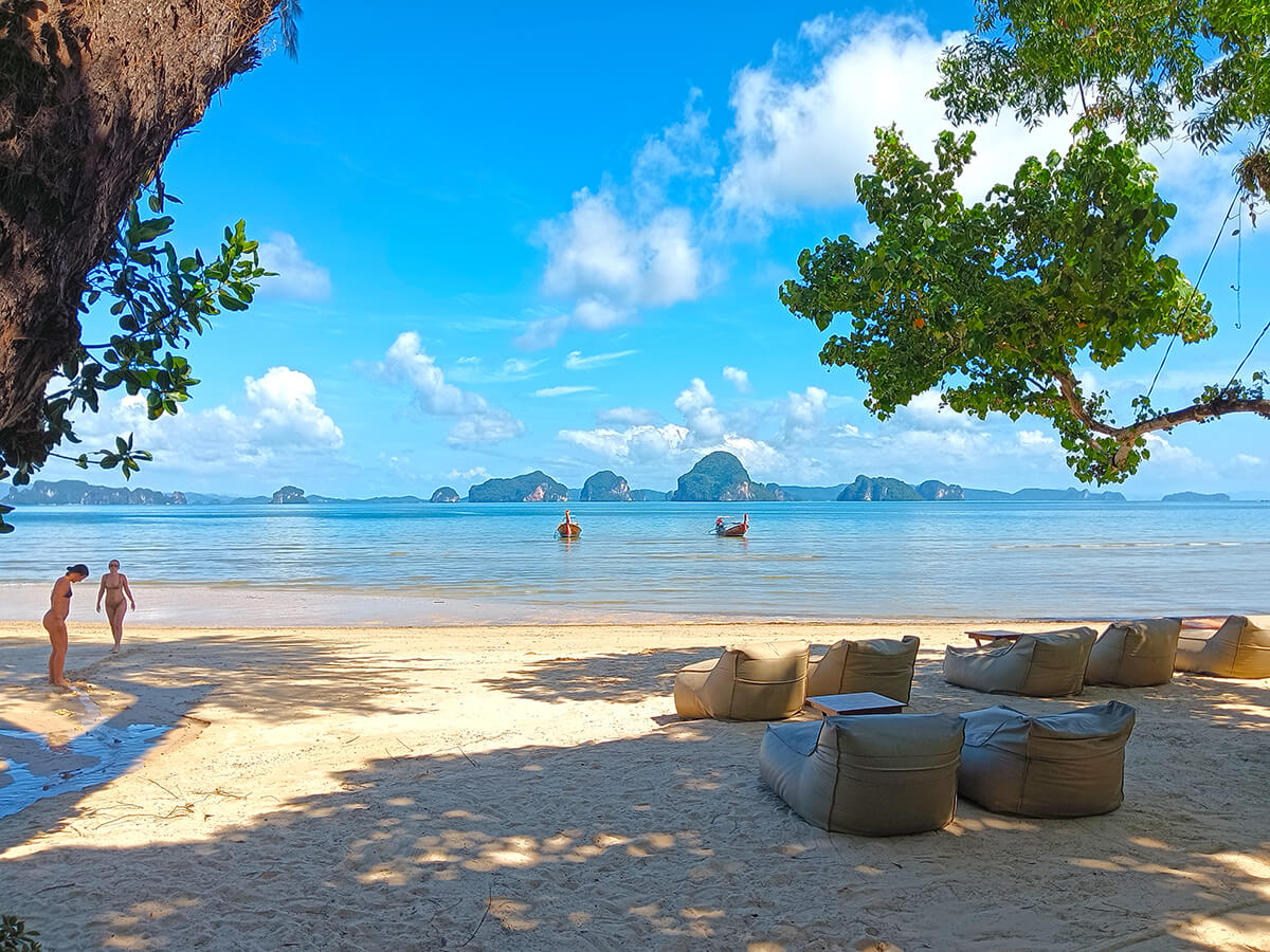 The beach area is beautiful, with a stunning view of the Krabi Islands in the distance.