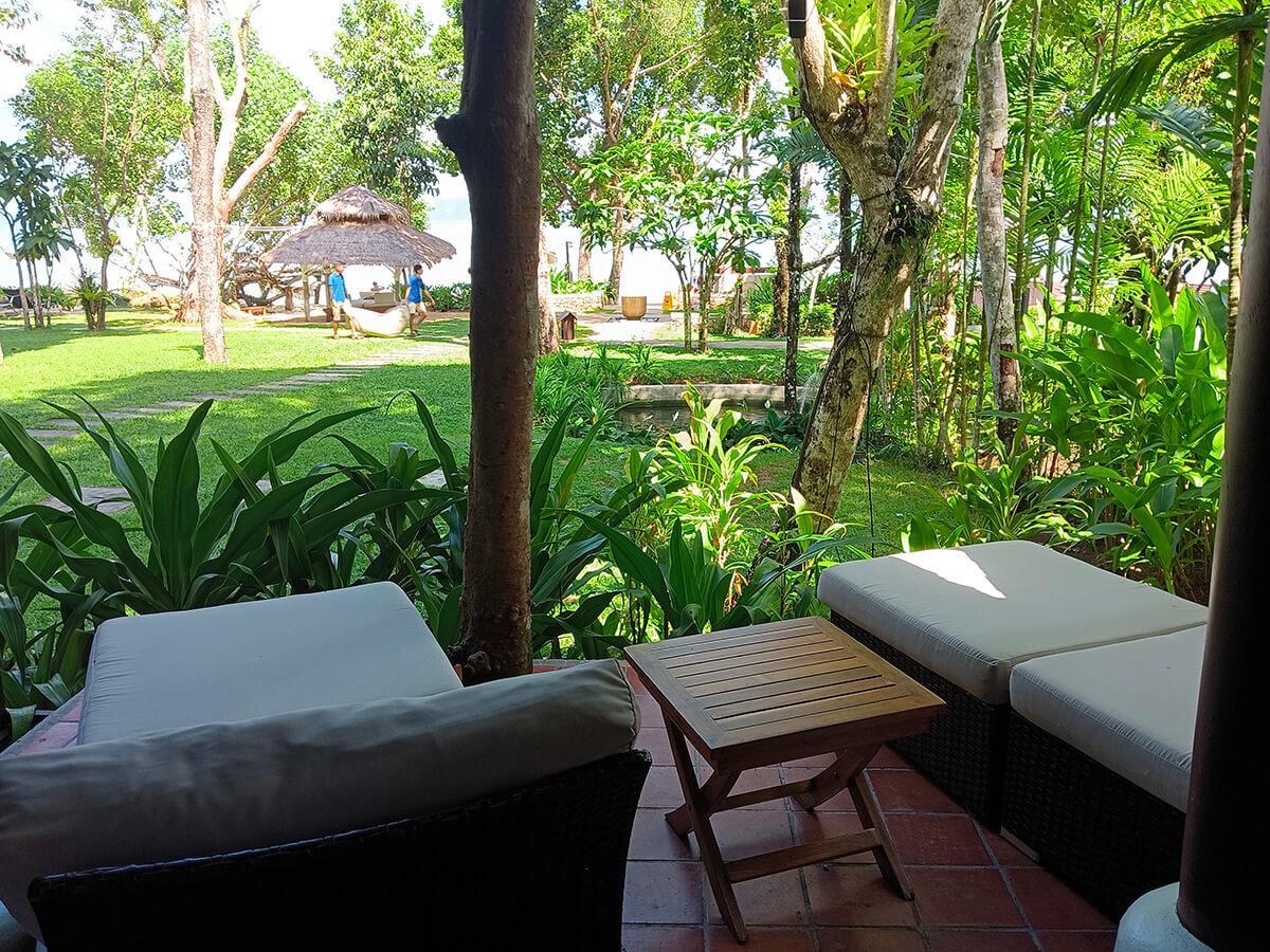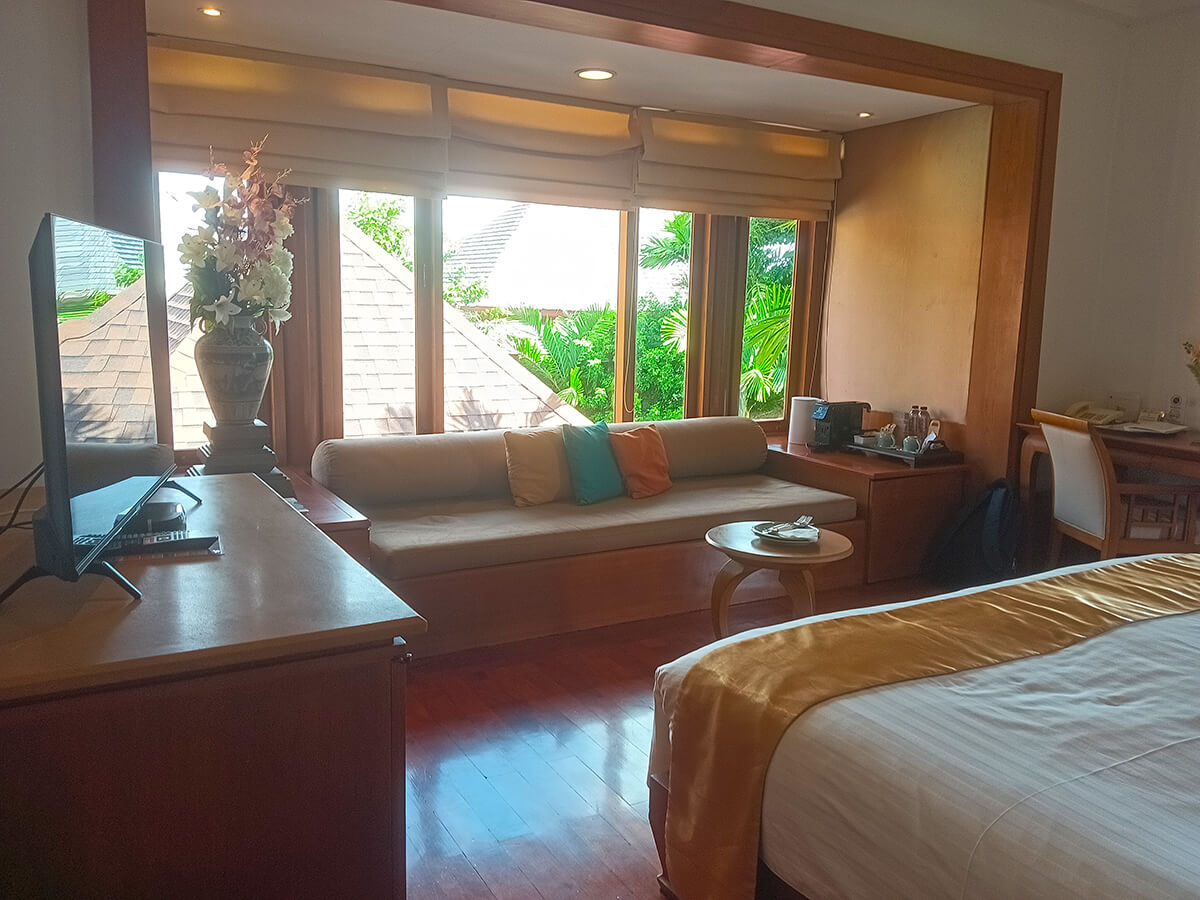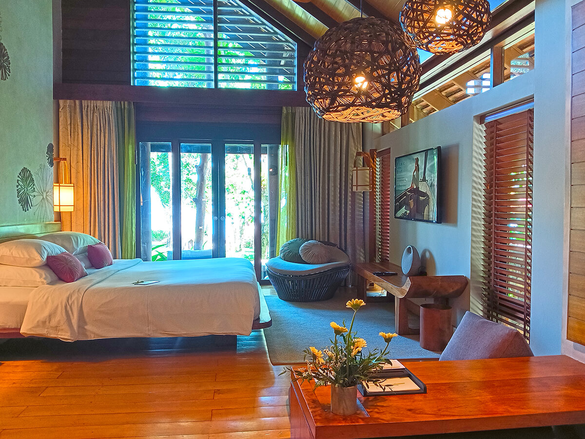 We stayed at Sala Villa Seaview, which had the most amazing views from the bungalow porch. The villa was spacious, featuring an outdoor bath, a large bathroom, and separate sinks and wardrobes for ladies and gentlemen. The villa boasts comfortable seating both inside and outside.