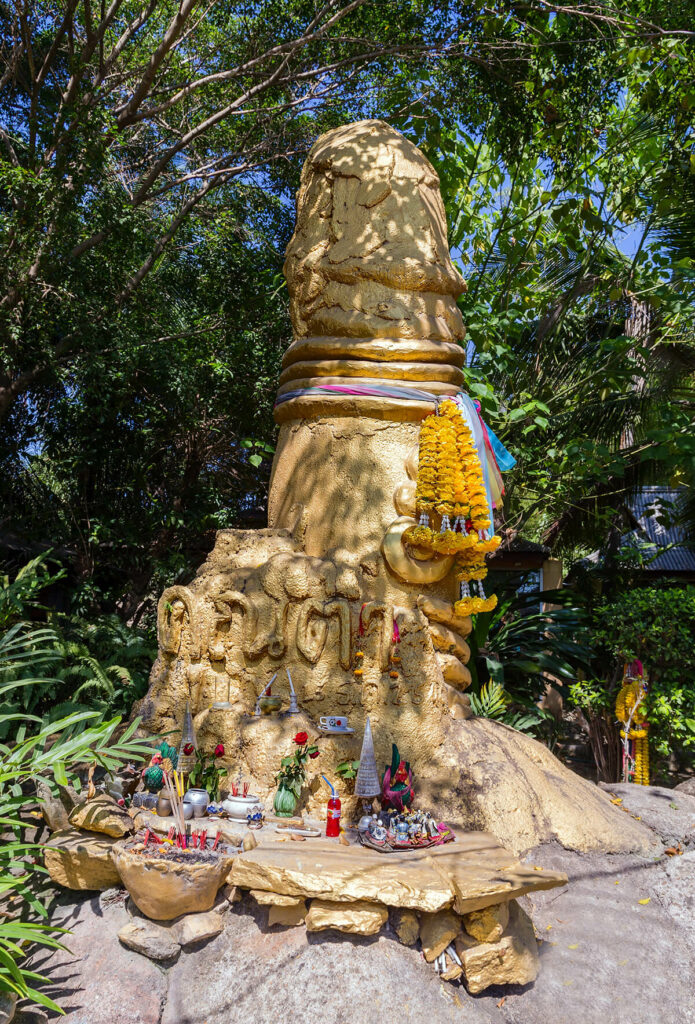 In Hinduism, a golden phallus is believed to protect from dangers, providing protection and positive fortune. Hindus view it as a symbolic representation of the Hindu god Shiva. The Thai word for phallus, which means penis, is Phalad Khik. It is believed that the statue was placed here as protection against the spirit lady on the Ghost Road (as above). They believe that the golden phallus would make the lady spirit happy, thereby protecting others on the Ghost Road.
