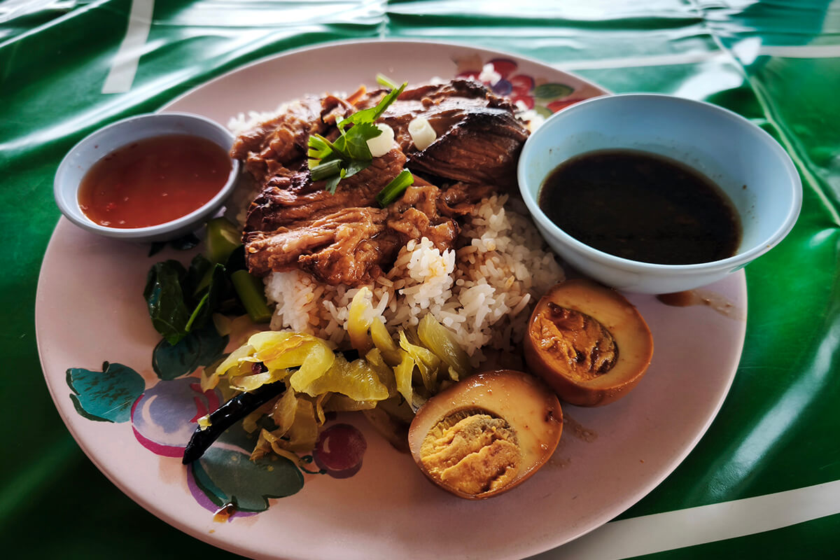 Khao Ka Moo is another very popular Thai dish. The brown sauce simmers the pig leg for hours. A vinegar sauce complements it, which you pour over the dish. It’s served with rice, kale and pickled cabbage. This restaurant is another family restaurant, serving locals for many years with their special dish.