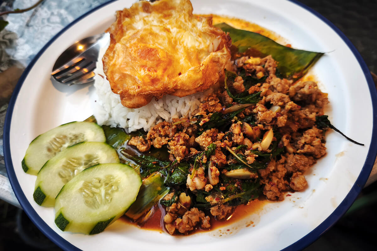 A popular street food, this dish features ground pork stir-fried with holy basil, garlic, and chilli, served over rice with a crispy fried egg on top. This dish is spicy, savoury, and irresistible. Northern style is drier than southern style, and different spices are added.
