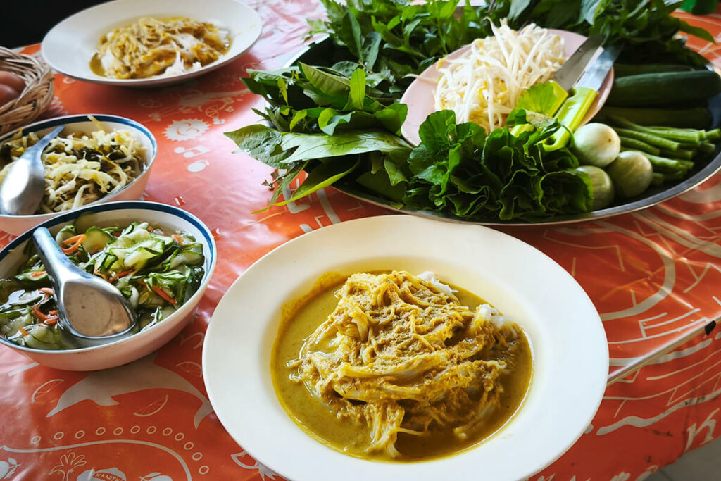 Kanom Jeen, a breakfast and lunch favourite, are cold rice noodles served with a variety of curry sauces, pickled vegetables, and boiled eggs. The southern version is particularly spicy and rich.