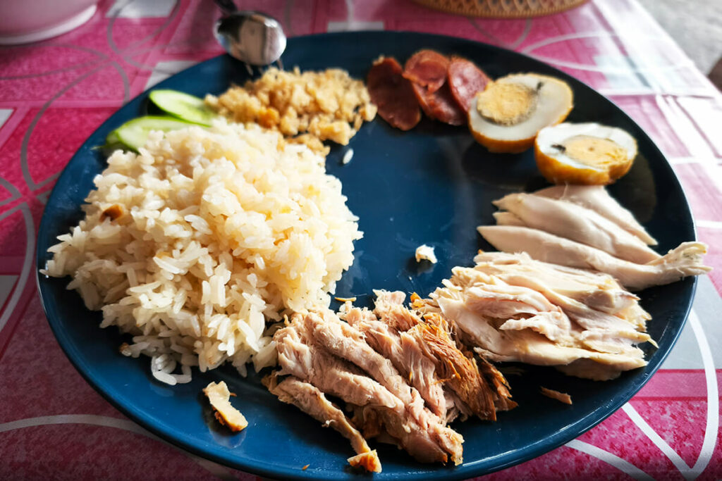 Simple yet satisfying, this dish consists of tender boiled chicken served on fragrant rice with a flavourful garlic-chilli-ginger sauce and a bowl of light chicken broth. This dish is a classic example of Thai comfort food.