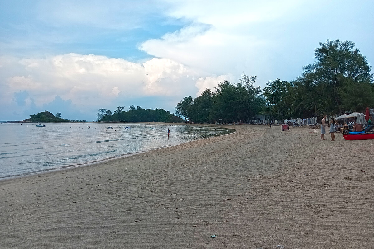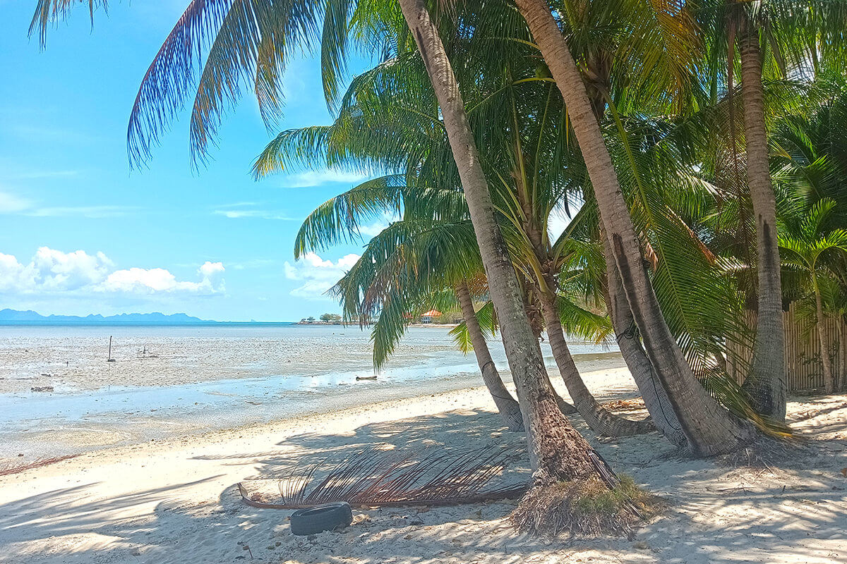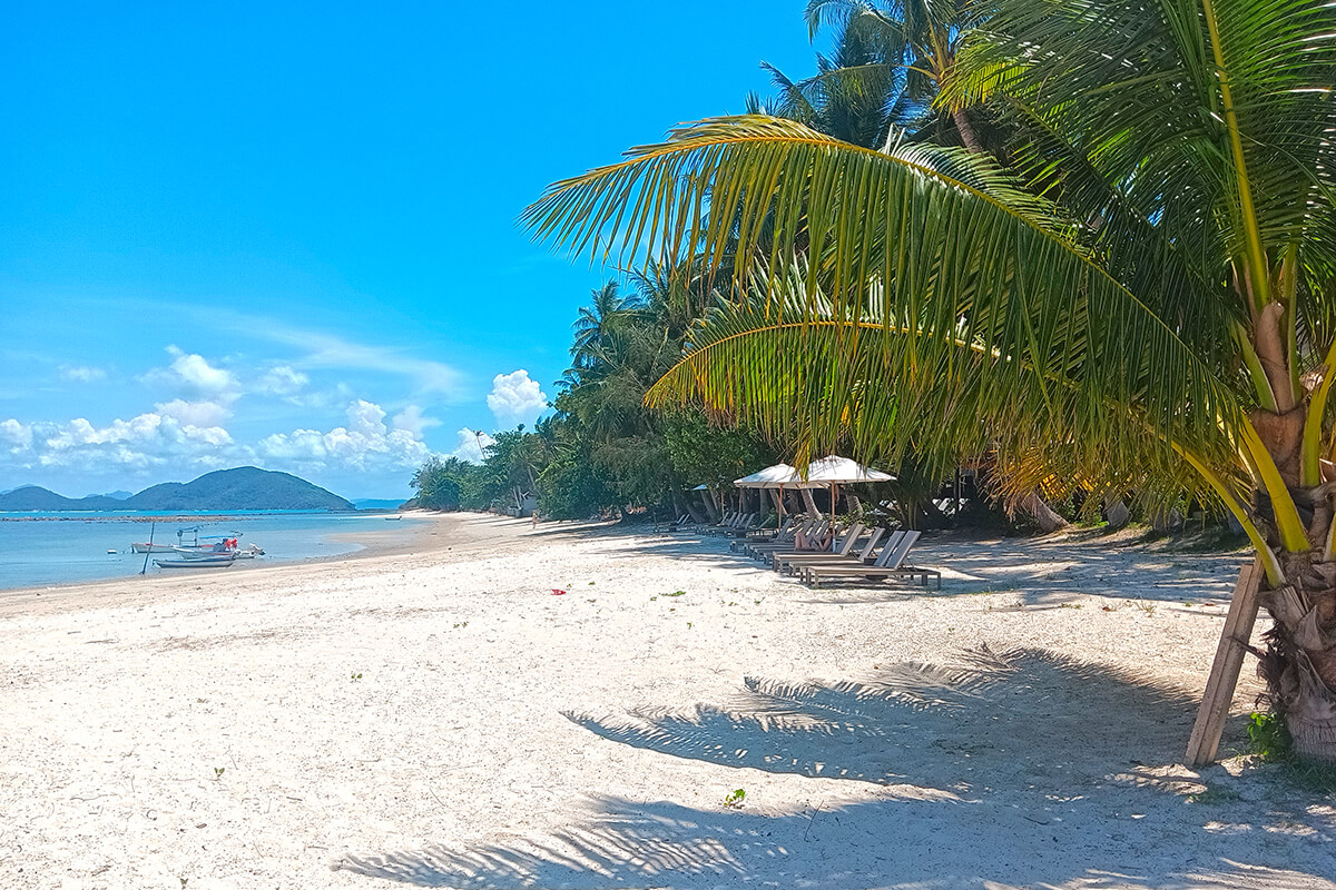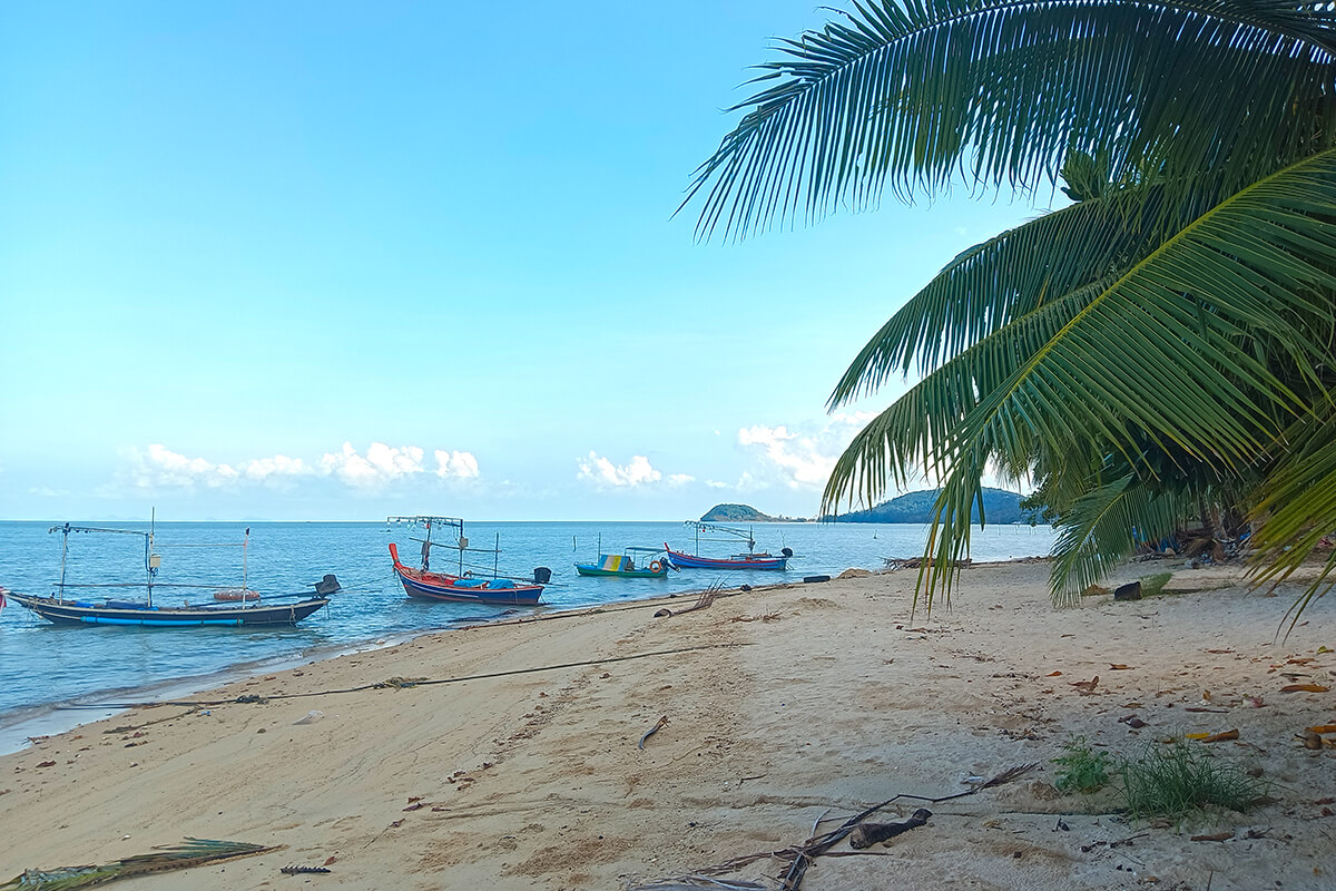 Plai Leam Beach. Is fringed with coconut trees the sand is sharp and used for mooring boats. A great sunset spot. Has a beach club to visit.