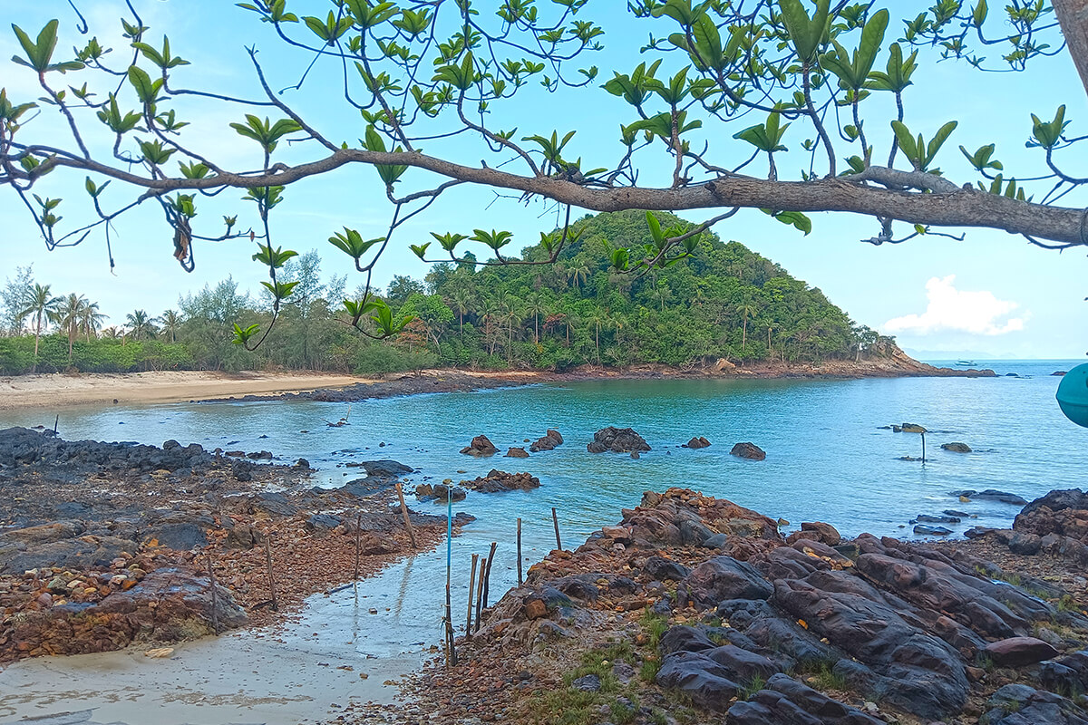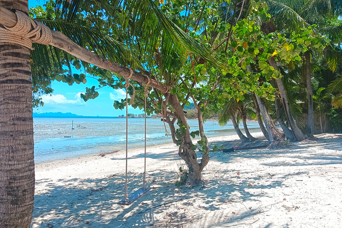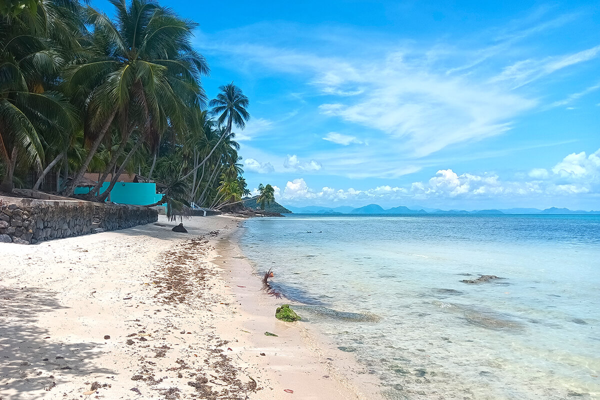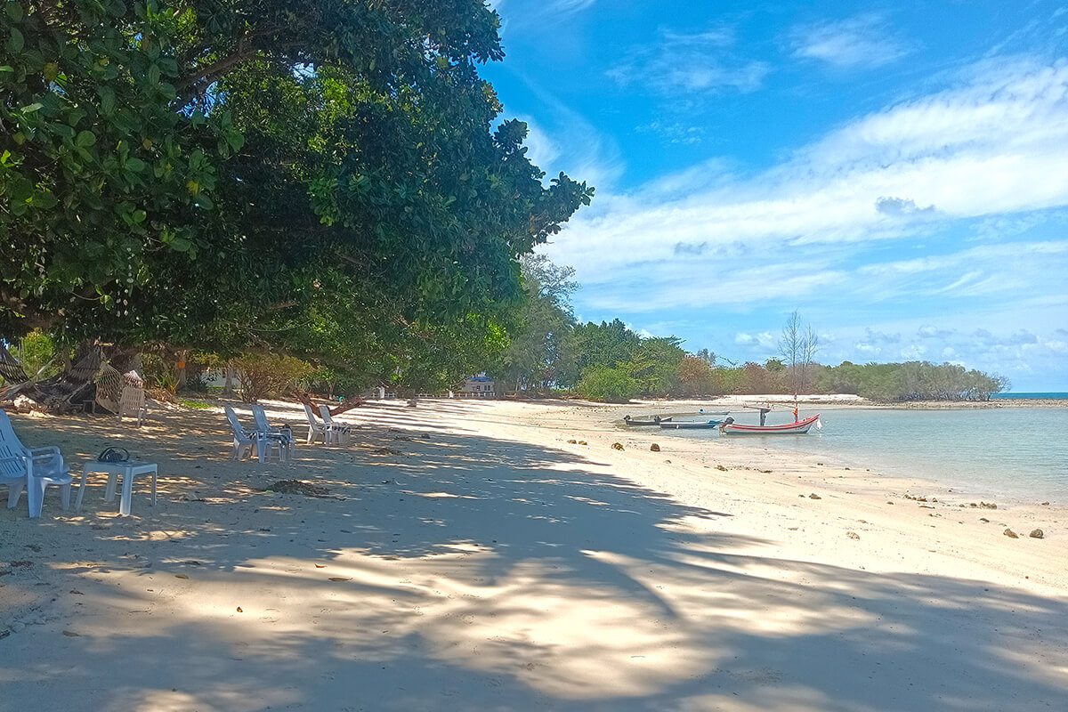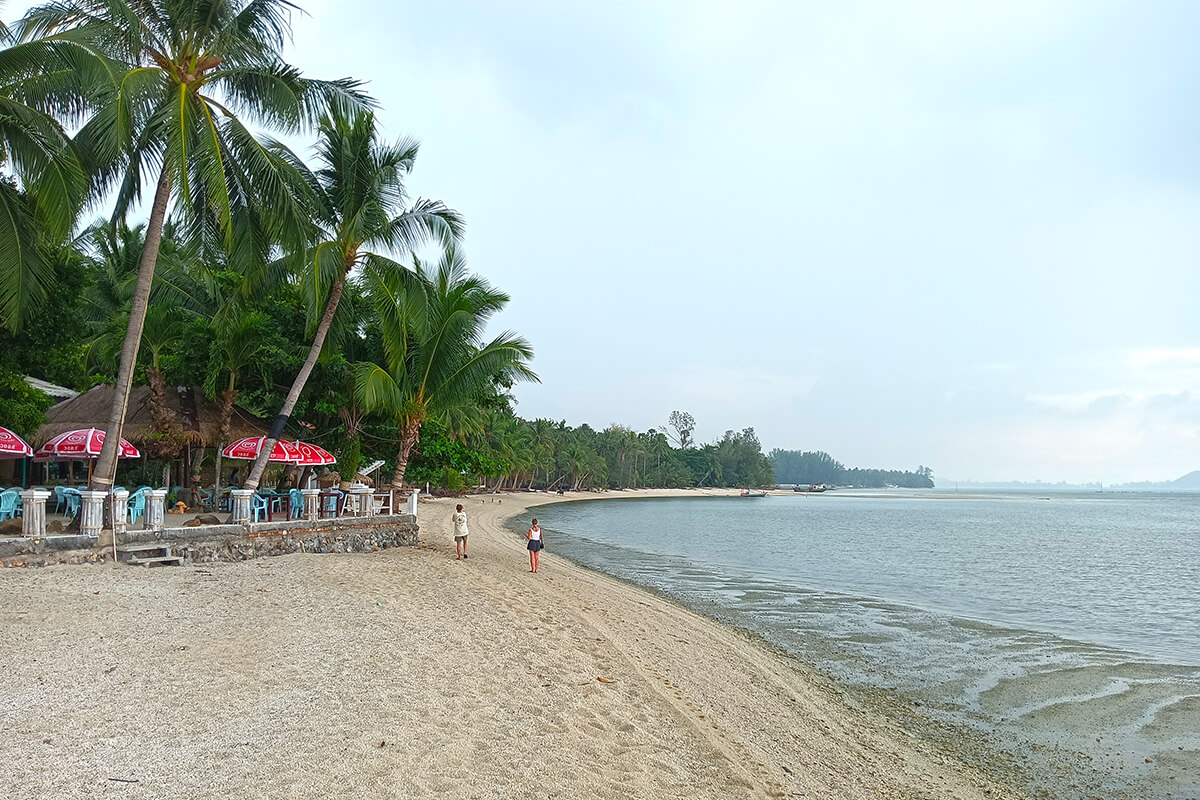 Plai Leam Beach. Is fringed with coconut trees the sand is sharp and used for mooring boats. A great sunset spot. Has a beach club to visit.