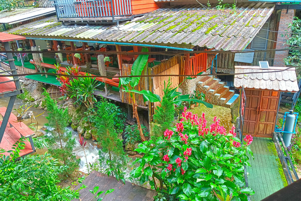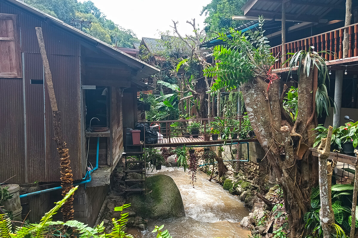 The stream from the Mae Kampong waterfall flows on either side of the valley, providing a soothing sound as you relax at your homestay or stroll around.