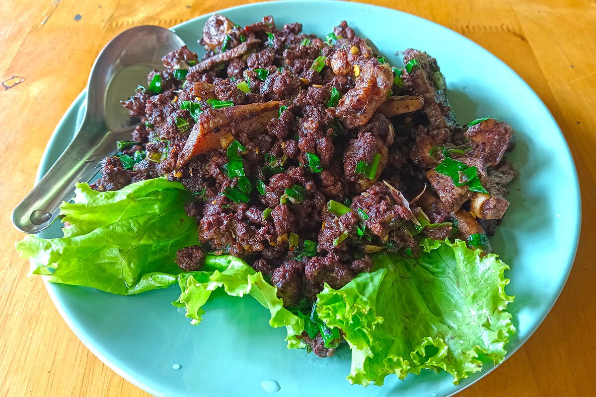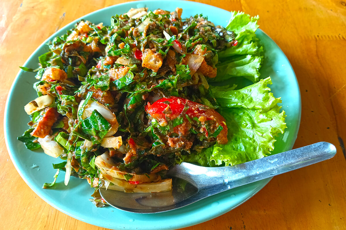 Mae Kampong is better known for its fermented tea leaves, teas, and salads. The tea leaf salad is much the same as the Burmese tea leaf salad.