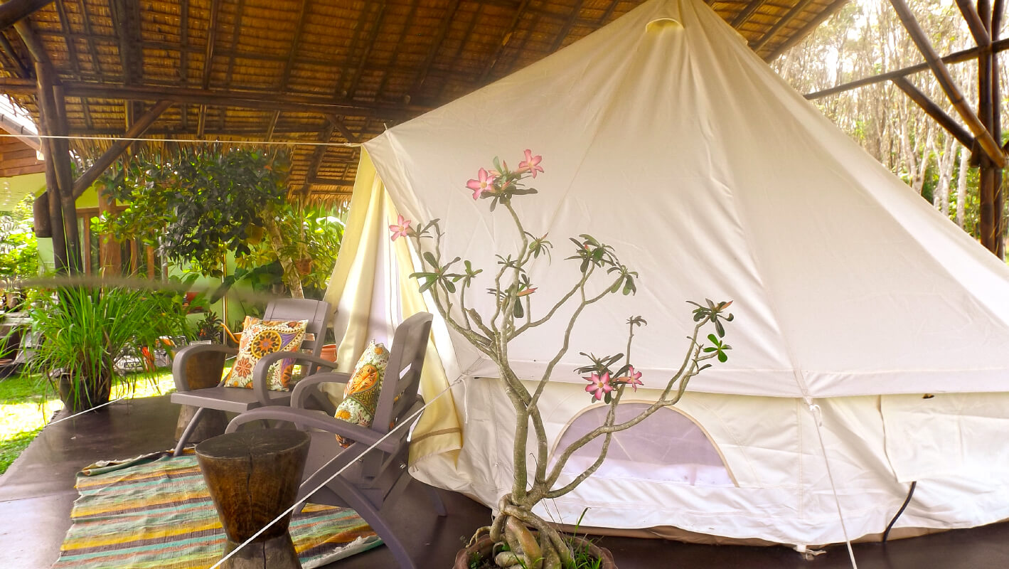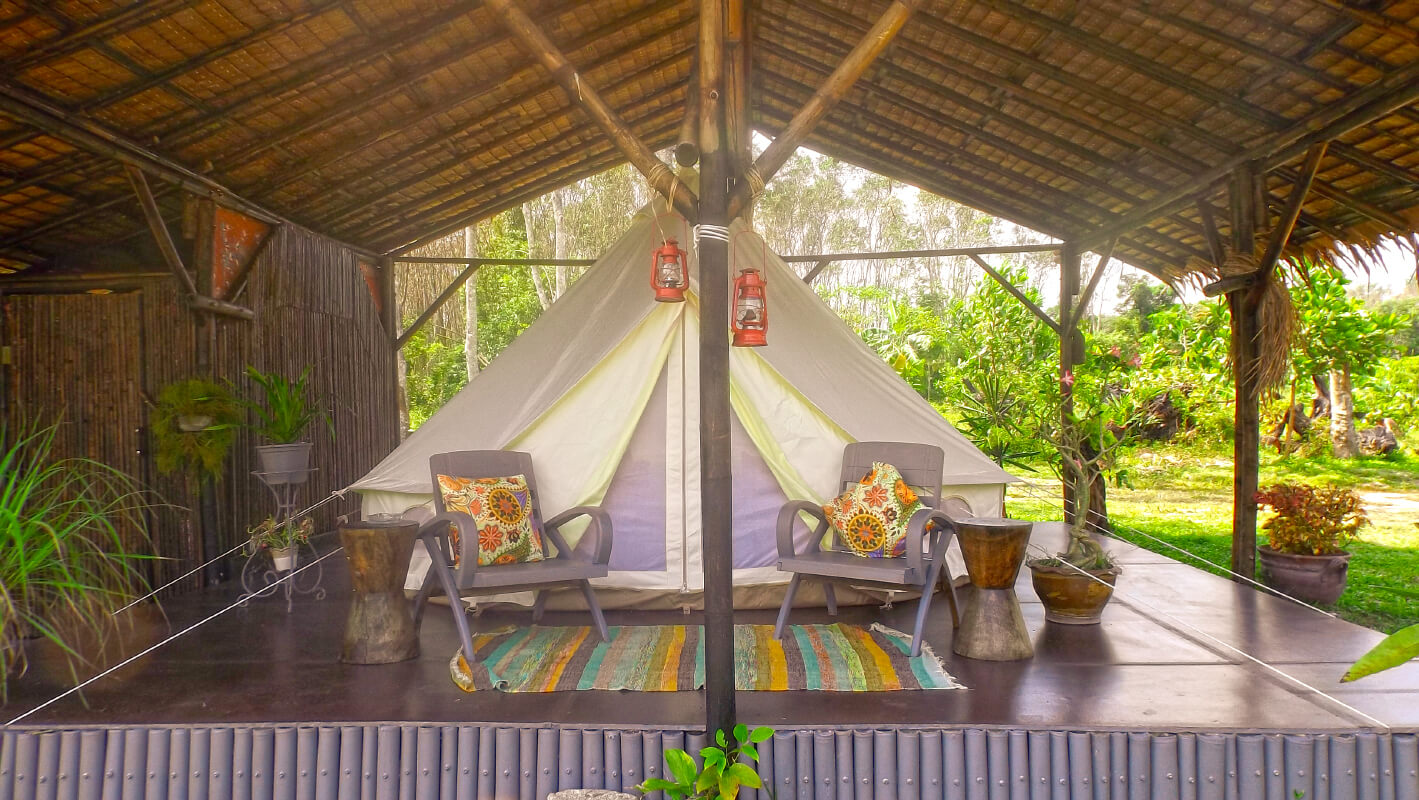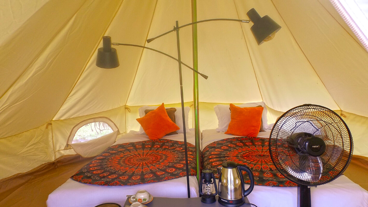 The inside of the mud hut is comfortable, with a cozy feel. The Glamping tent is comfortable, with a decking area, chars and tables to relax. The bathroom is adjoining the Glamping housing