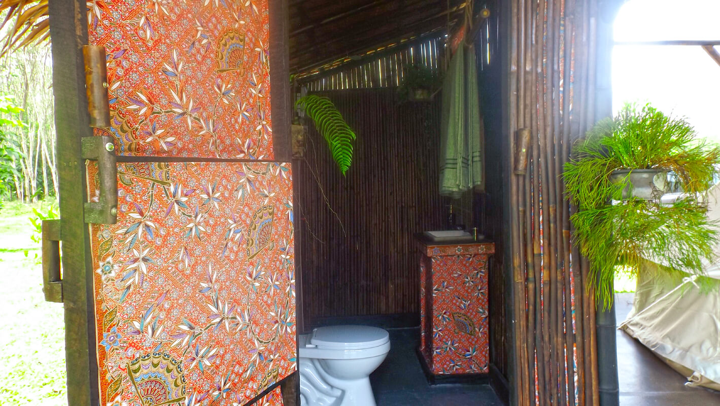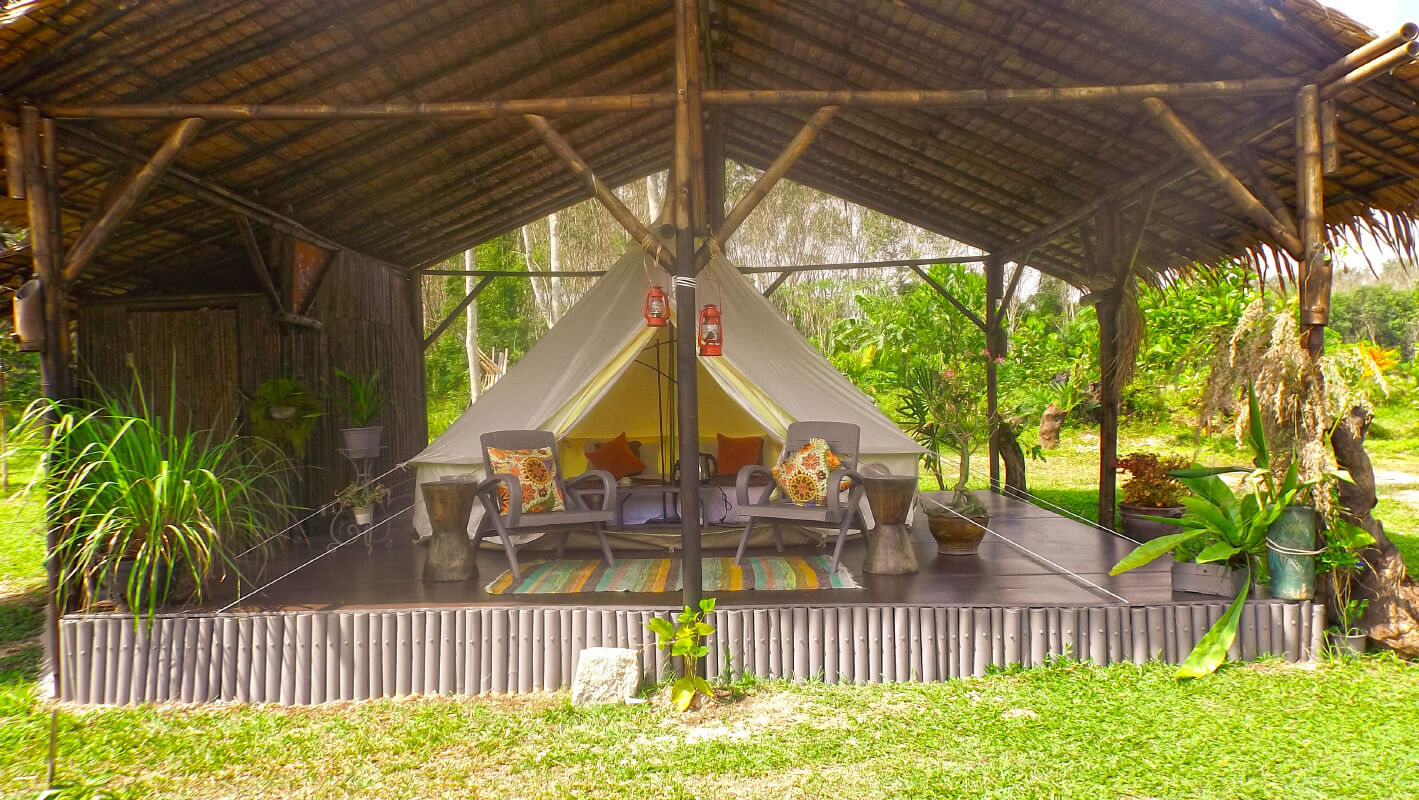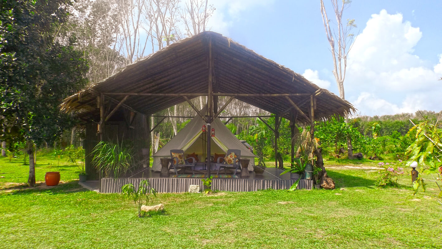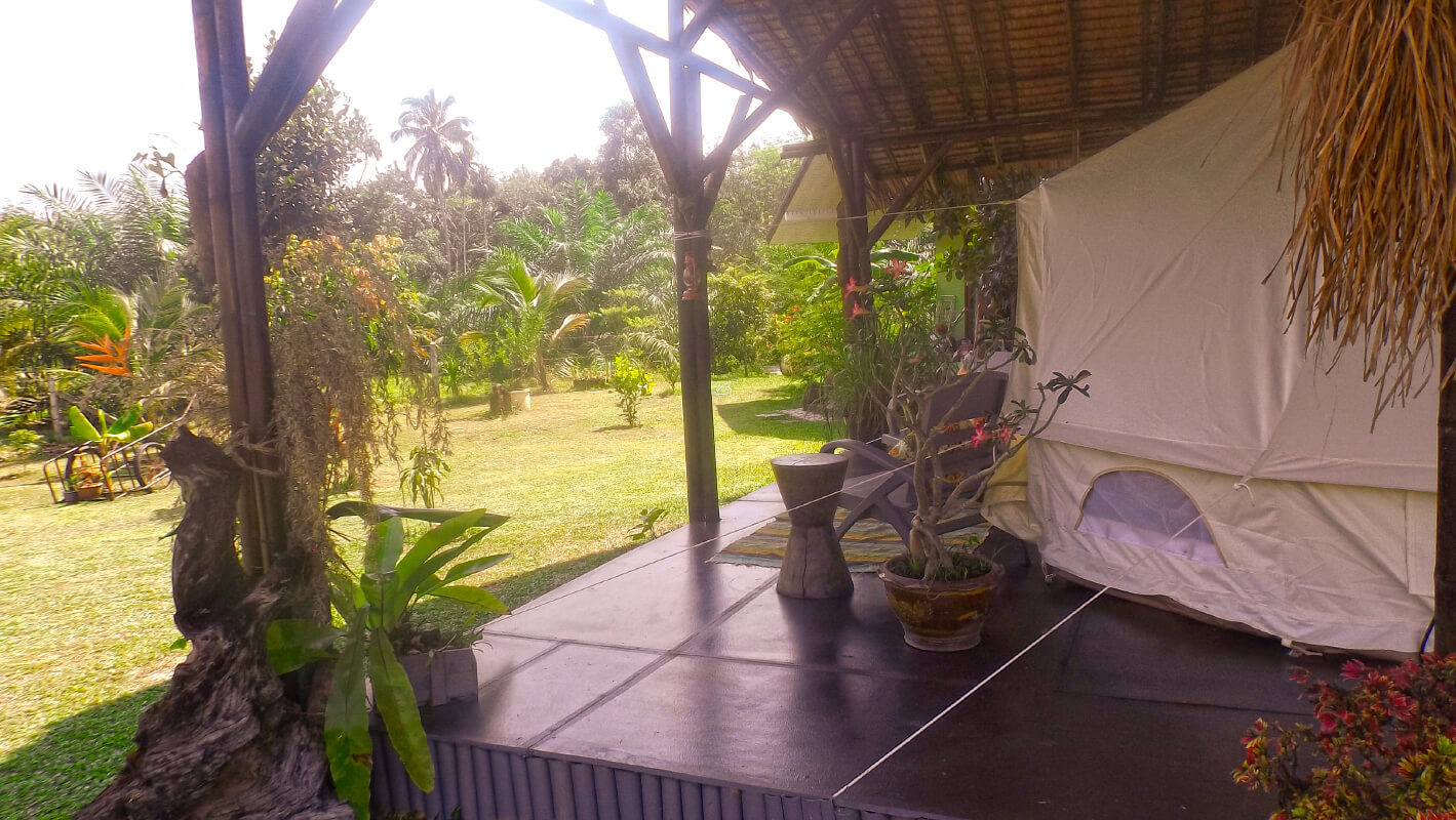 The inside of the mud hut is comfortable, with a cozy feel. The Glamping tent is comfortable, with a decking area, chars and tables to relax. The bathroom is adjoining the Glamping housing