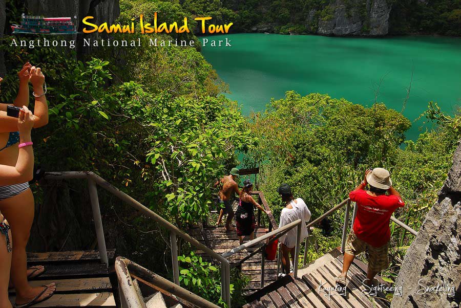 10.00 arrive at Angthong Marine Park, sail over by longtail boat or kayak to Mae Koh Island – Short climb approx 45minFollowing the hike, up some stairs, you will reach Talay Nai Emerald lake, stunning views you can see.