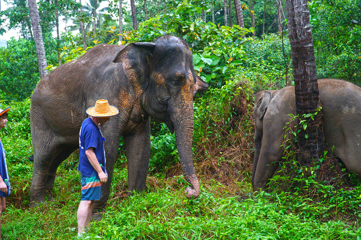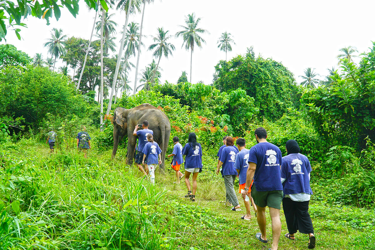 The elephants’ daily routine includes walking through the jungle with them during the elephant mud spa experience.