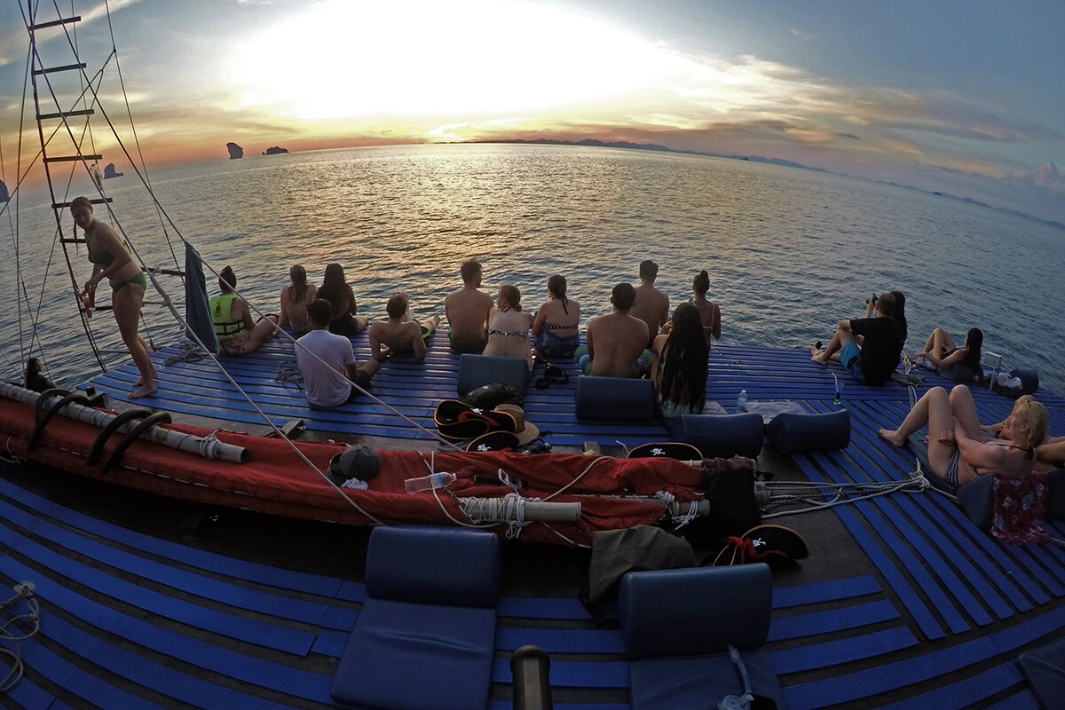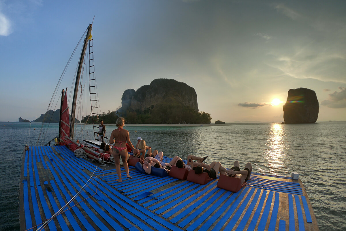 The junk boat offers history and comfort, with comfortable cushions spread across the spacious deck and room to stretch out and relax. The music onboard sets the perfect mood, whether you’re enjoying a slow-paced sail or soaking in the Krabi sunset. Our vibrant red sails catch the eye and add a touch of flair to the journey.