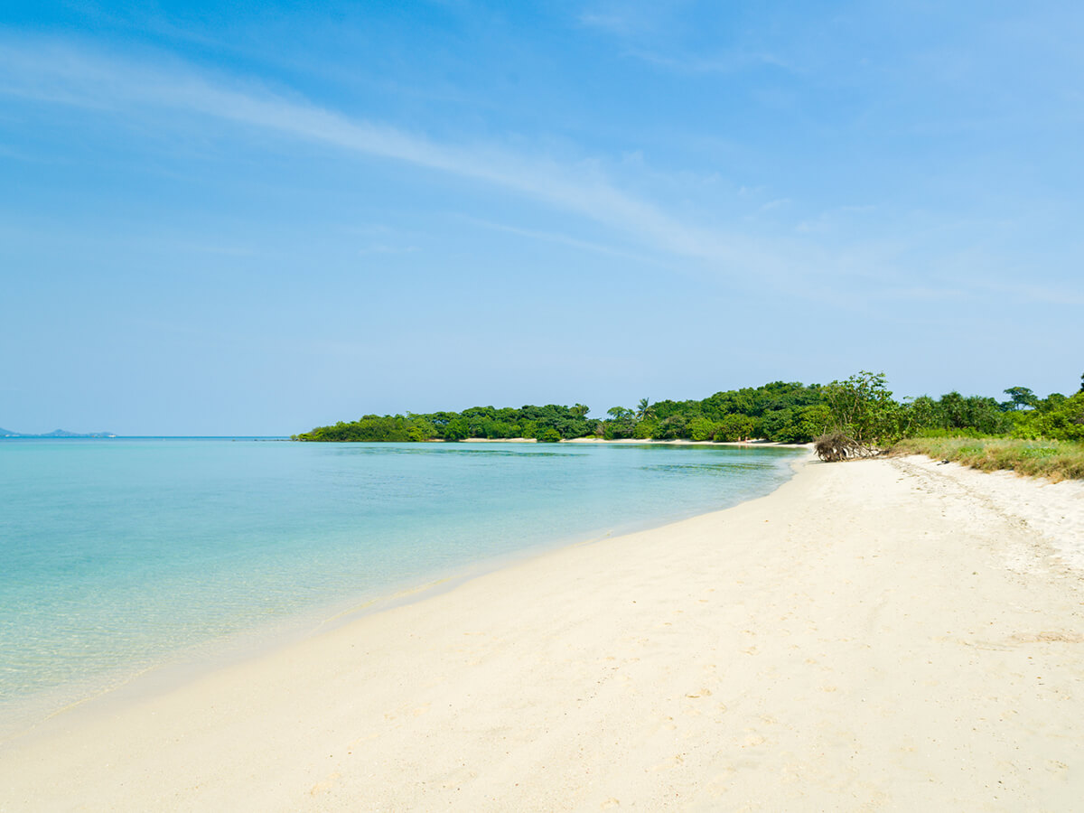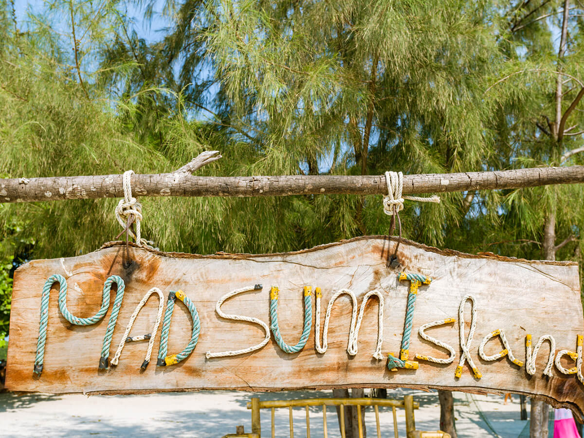 Koh Madsum is south of Koh Taen and directly opposite the beach at the Laem Sor Chedi and Pagoda. Its beach is a long sandy beach and a favorite with local Thai.
