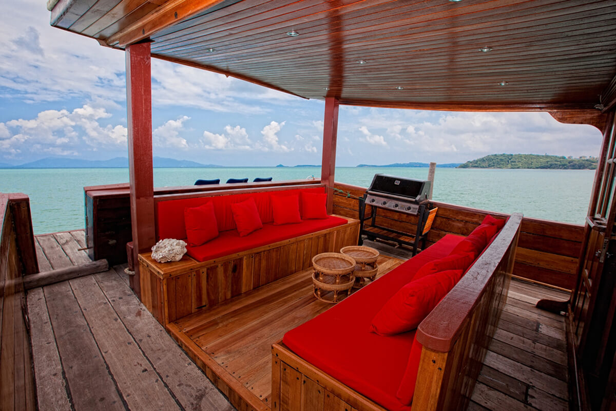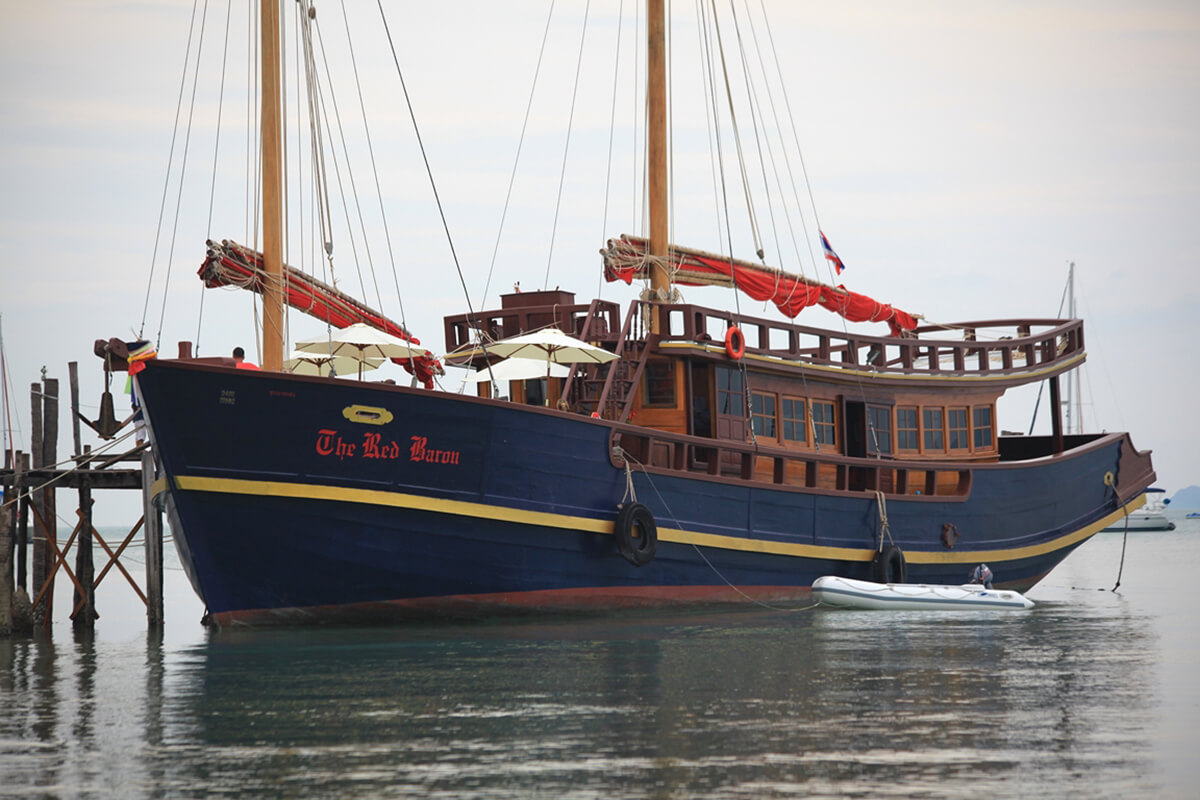 Private Charter Junk Yacht is one of the largest sailing yachts in the area around Koh Samui, making it the perfect choice for weddings, pre-wedding tours, and more. Sail aboard this elegant junk yacht to Angthong National Marine Park, around the stunning bays of Koh Phangan, the famous Pig Island, and Koh Taen, or enjoy a romantic sunset cruise; the choice is yours. Depending on how many hours booked, depends on what food options are available however a delicious buffet style meal is included with all options. The Red Baron is a sailing junk yacht made from takien tongue, a very strong hardwood. The junk yacht is elegant in design, internally and externally.