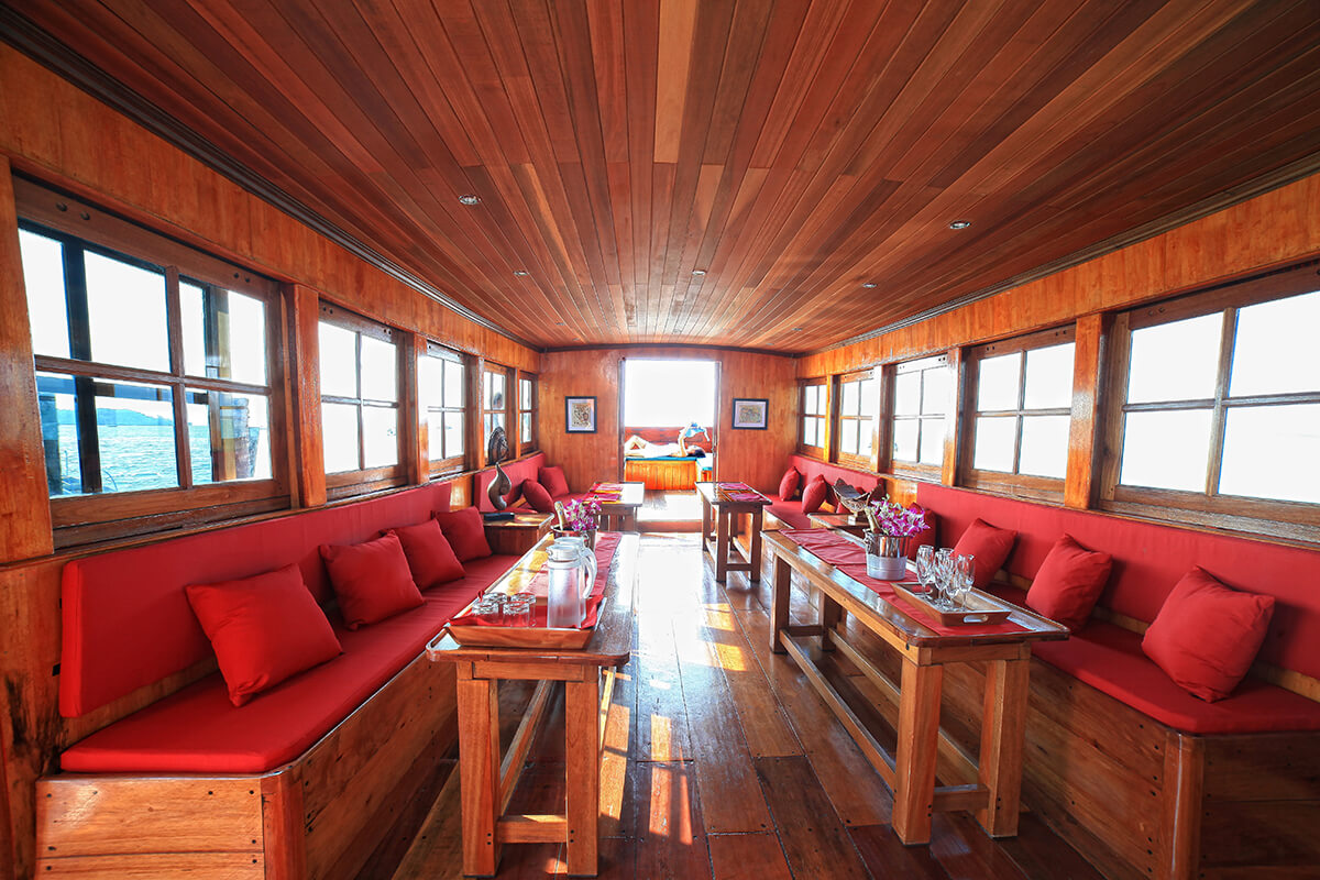 Open Air Dining Area with a massive wooden table, 16 wooden chairs, and side benches with upholstery, providing additional comfort for about 10 passengers.