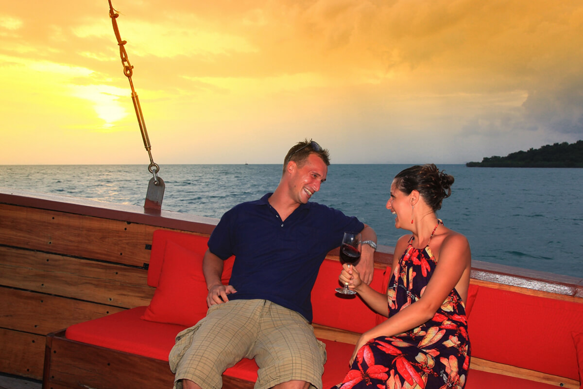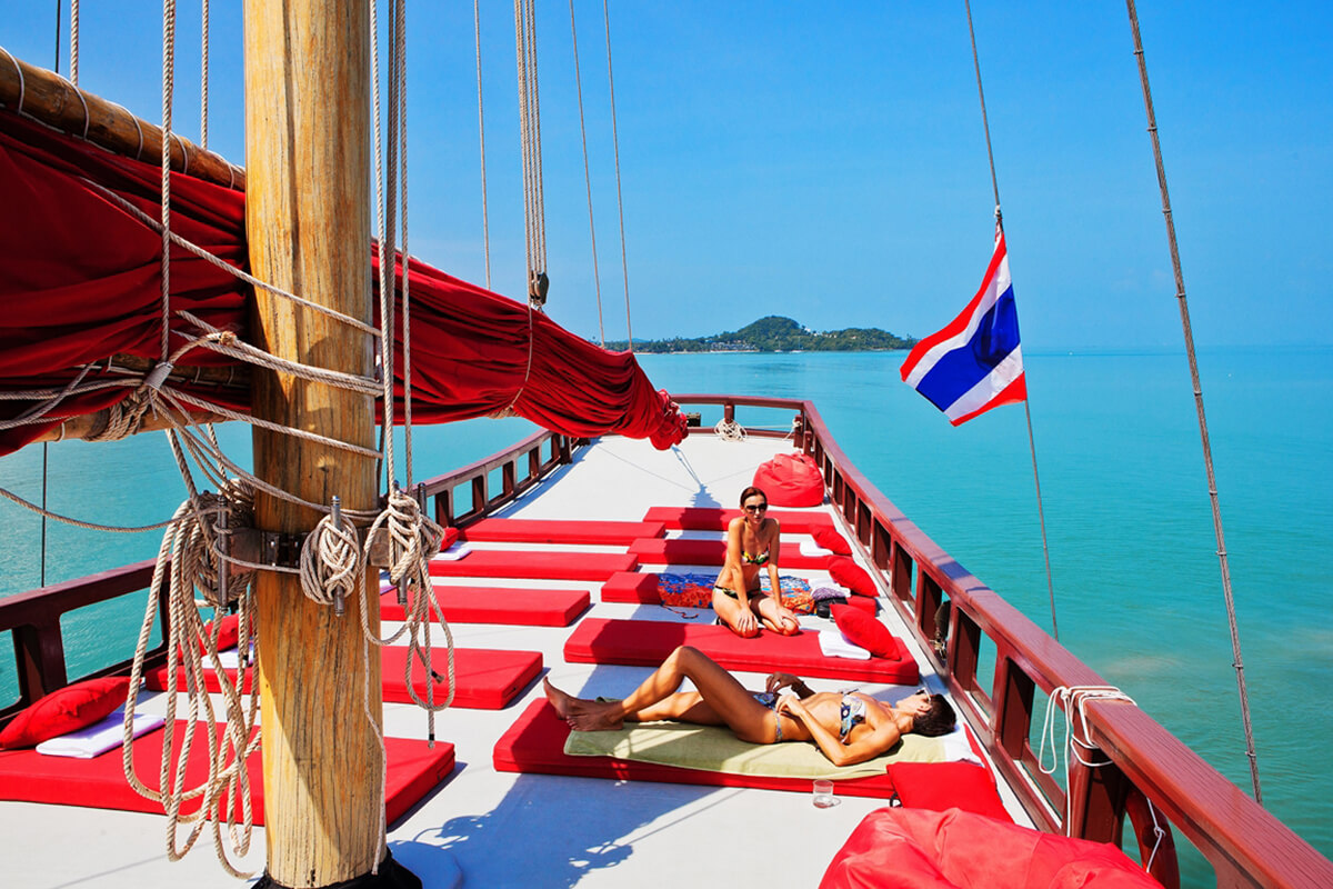 This elegant sailing junk yacht offers various destinations to which it sails. Options include the amazing Angthong National Marine Park, sailing around the stunning bays of Koh Phangan, visiting the famous Pig Island, or going on a romantic sunset cruise.