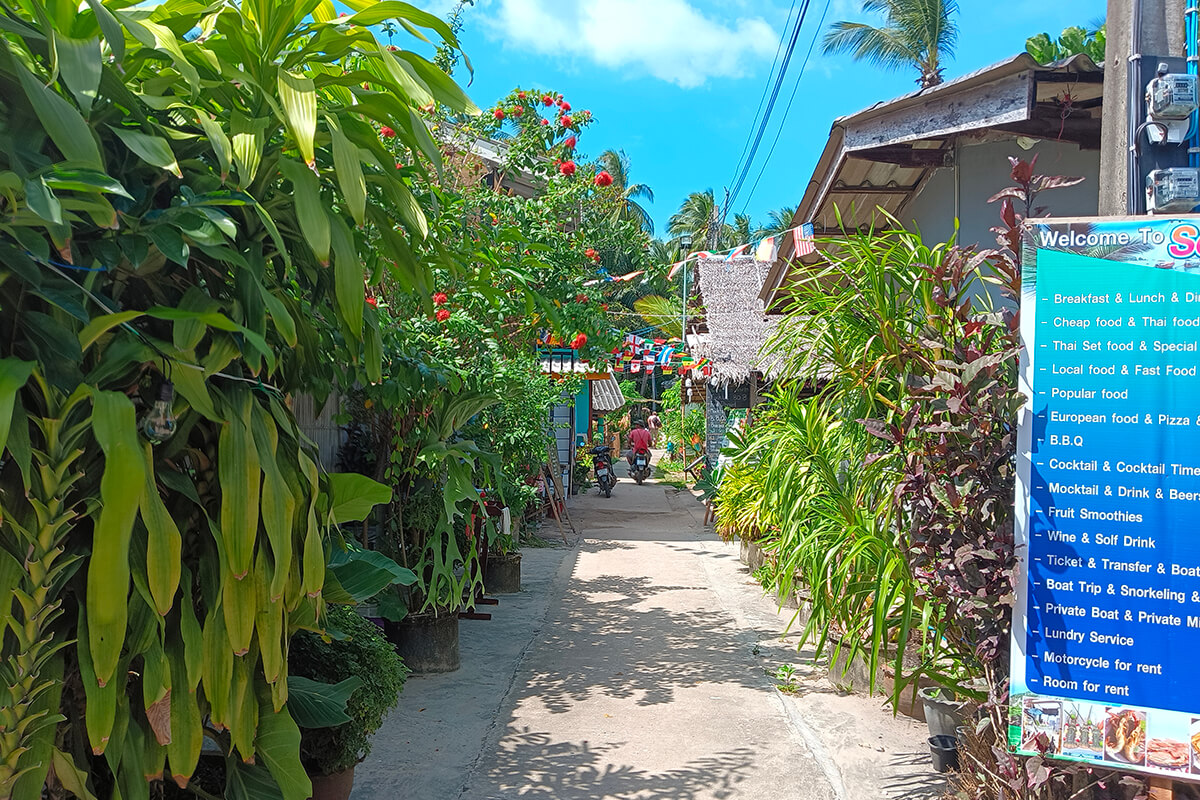 The vibrant restaurants and shops create a stunning backdrop against the sapphire blue waters of Koh Mook.