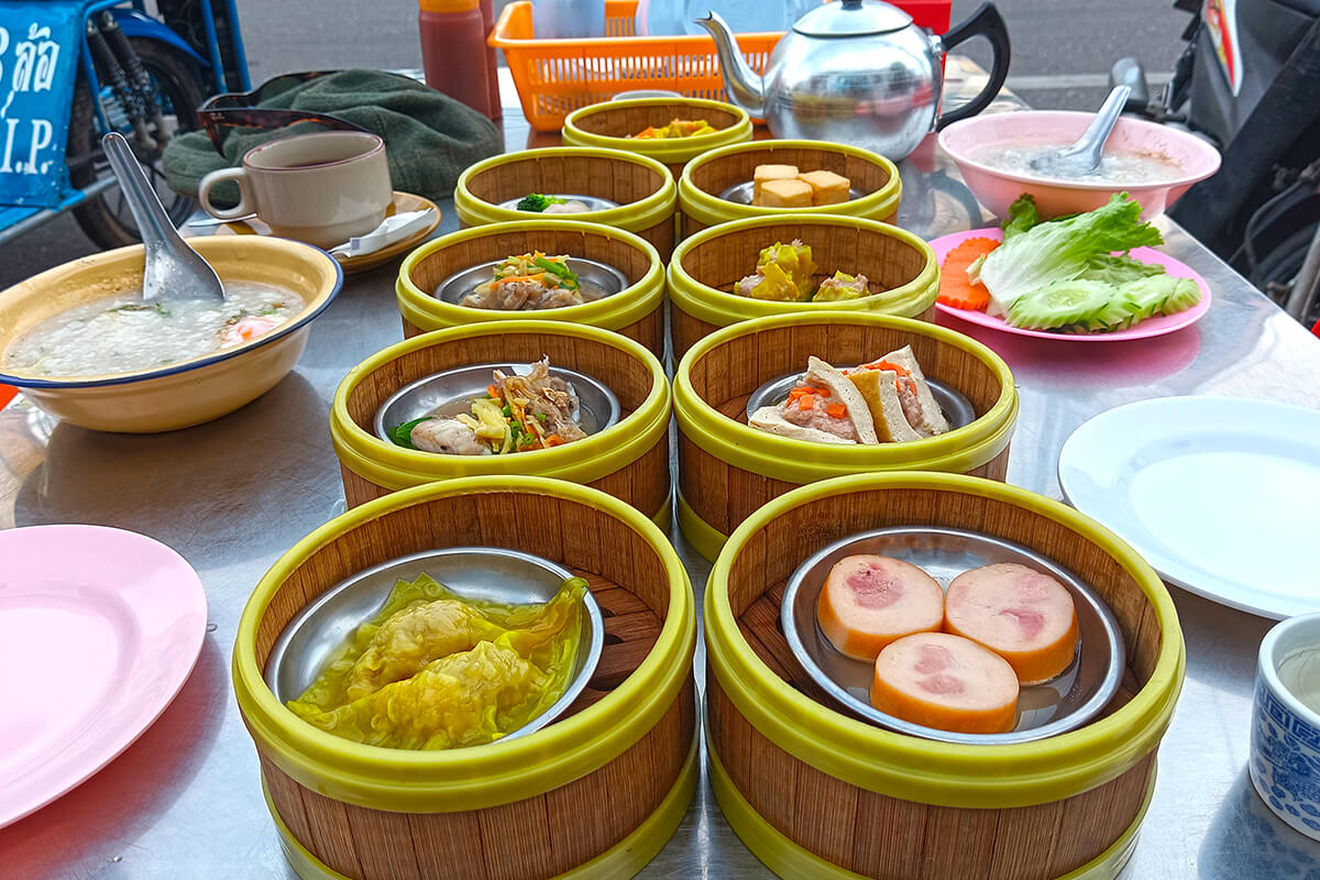 Dim sums start from 15 THB a tray ( a tray is the small baskets) You simply go inside and choose what you want, they heat it and then bring them to your table with complimentary hot morning fresh tea.