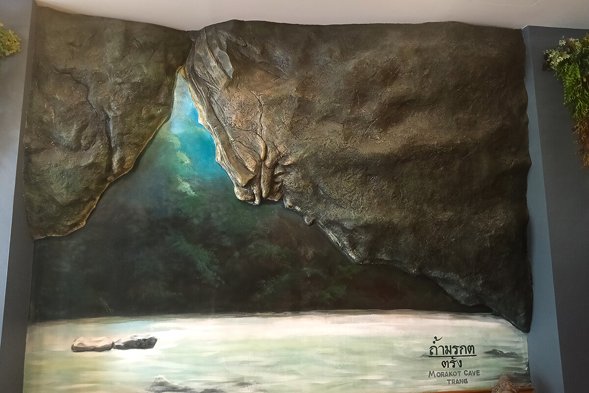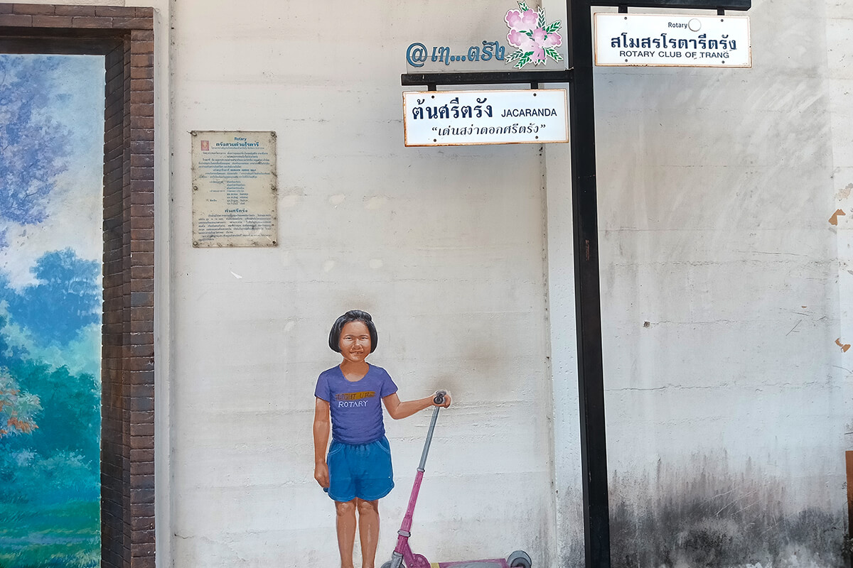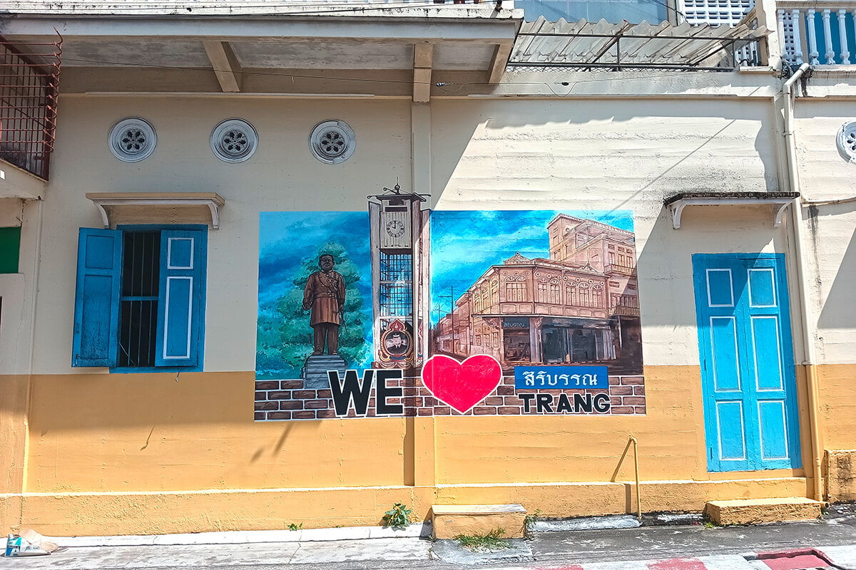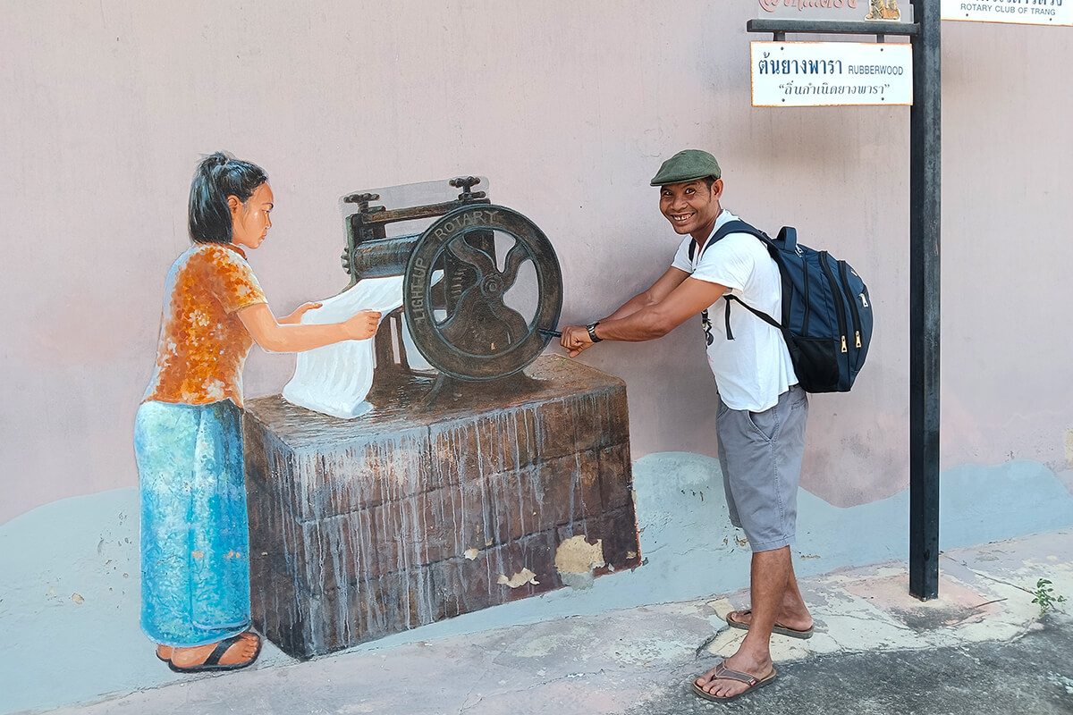 The street art around Trang, is mainly in one area, however the Emerald Cave is near the intersection of Ratchadamneon Road, The street art reflect the identity of Trang Province. The rubber planation is a reminder that Trang Province was the first province to plant rubber trees. A nice 1 hour to spend walking around downtown Trang.