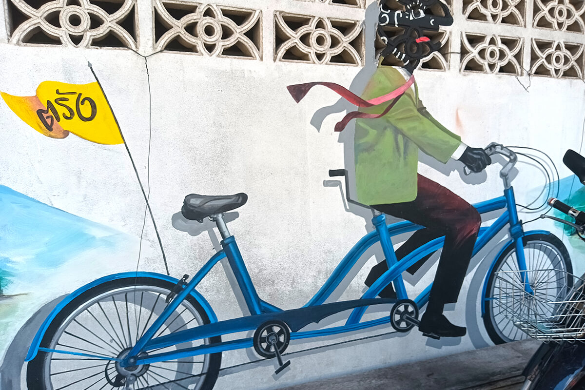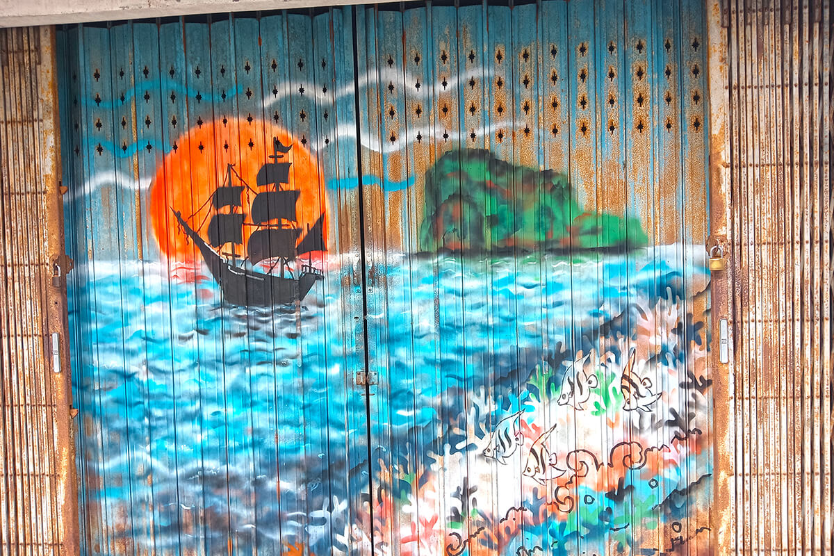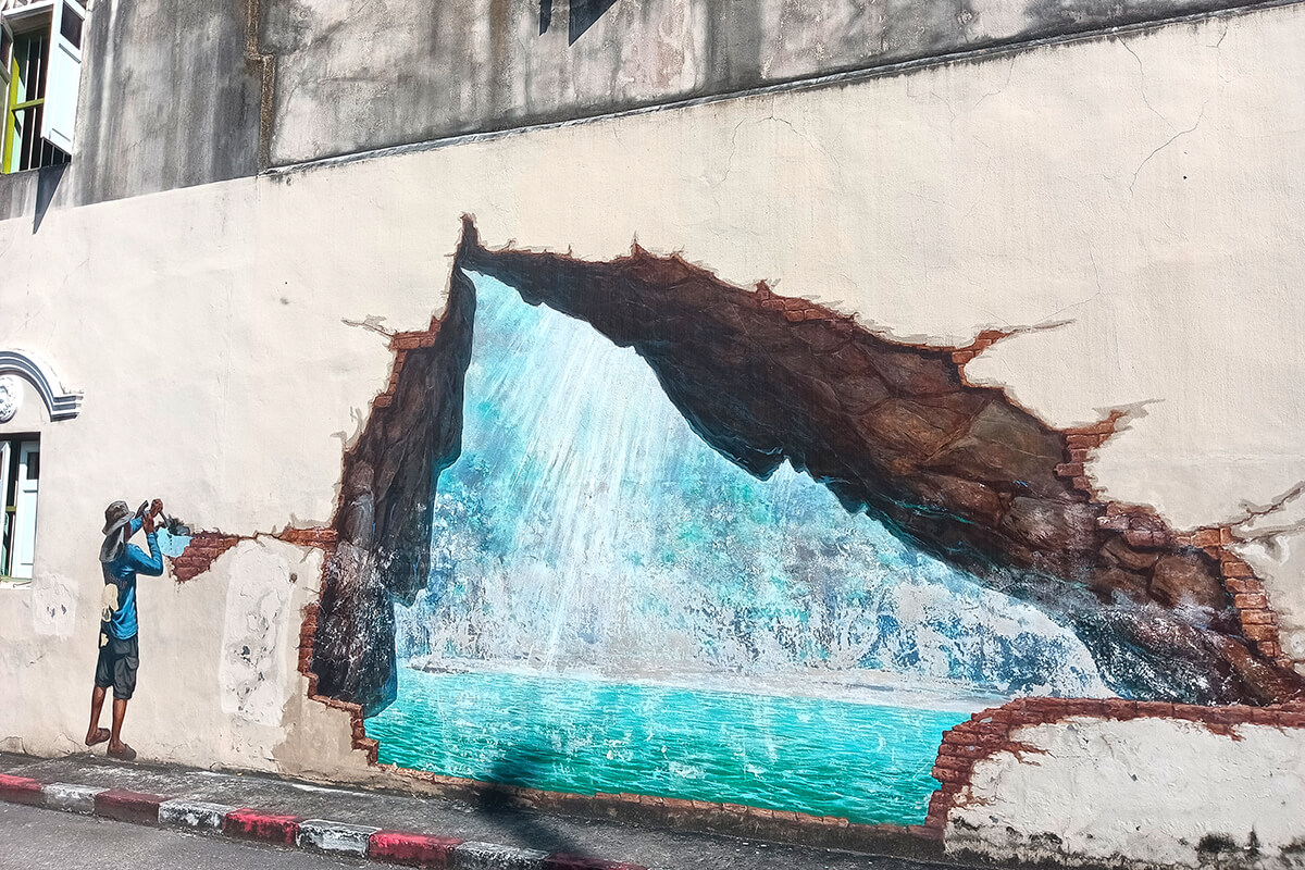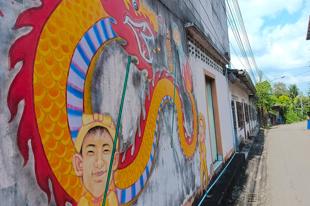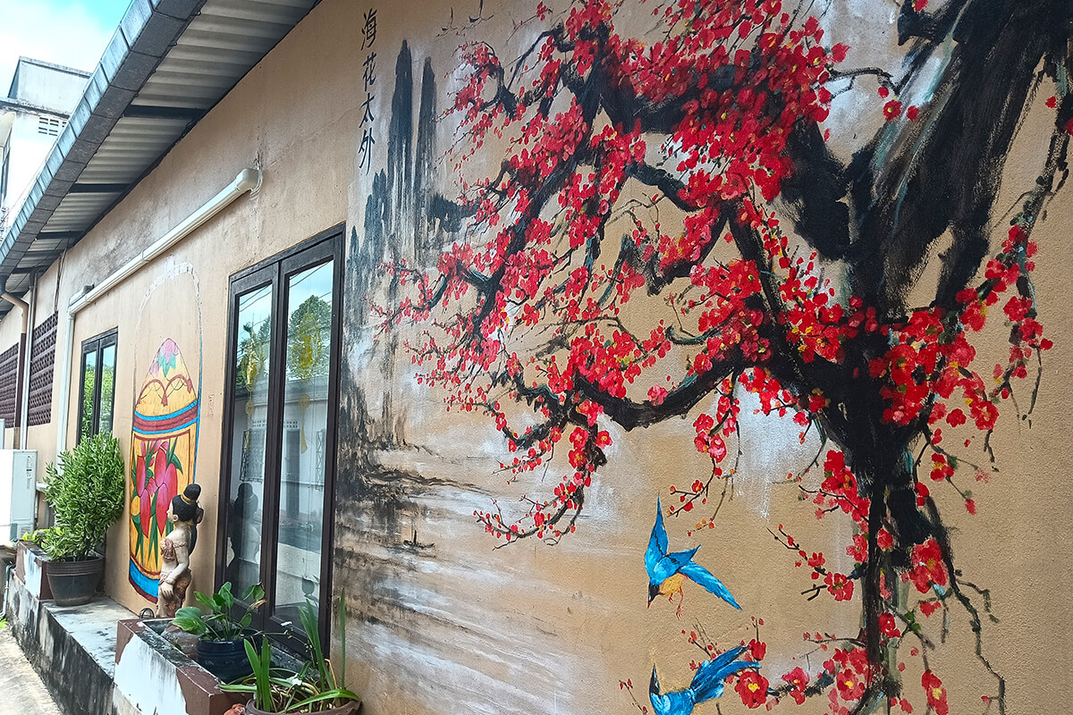The street art around Trang, is mainly in one area, however the Emerald Cave is near the intersection of Ratchadamneon Road, The street art reflect the identity of Trang Province. The rubber planation is a reminder that Trang Province was the first province to plant rubber trees. A nice 1 hour to spend walking around downtown Trang.