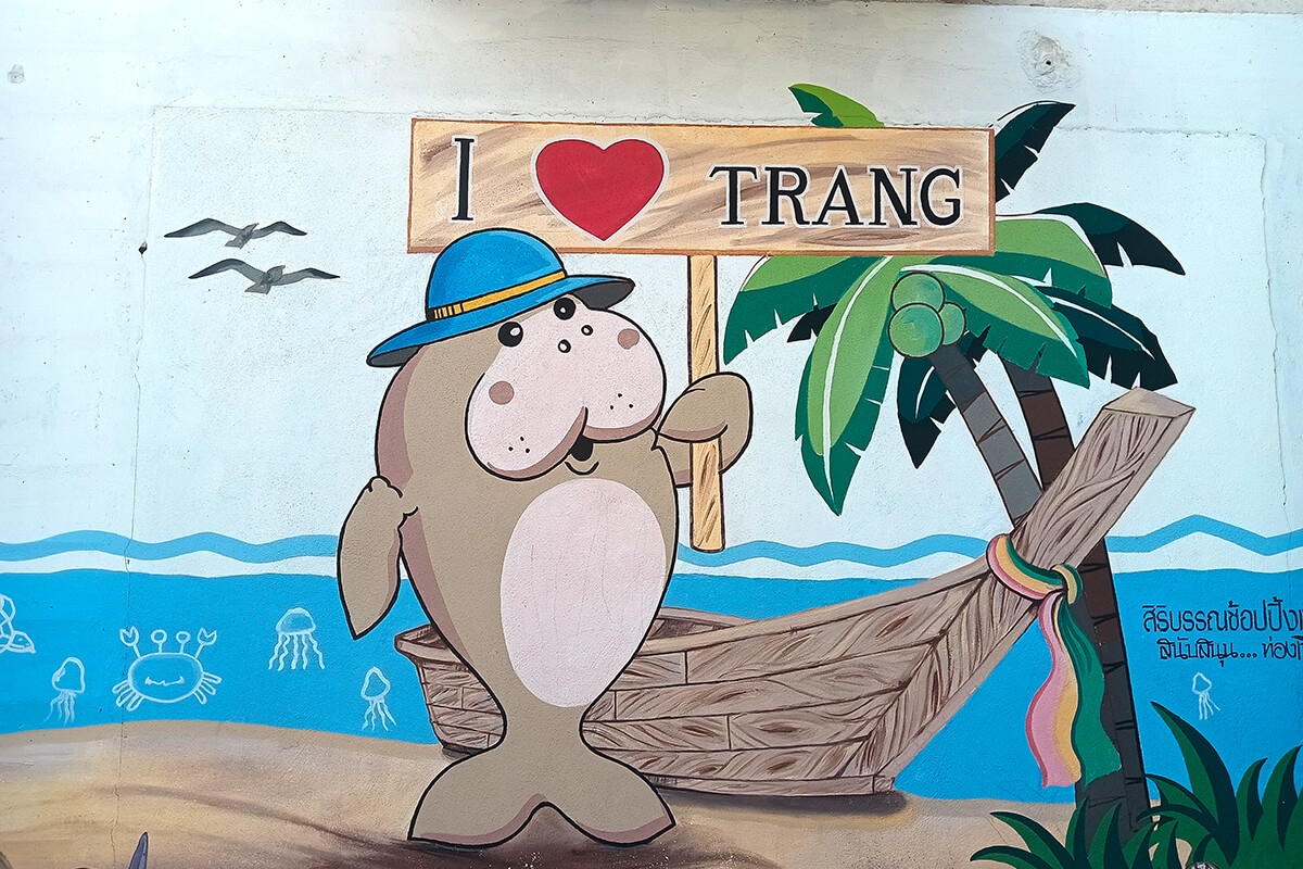 Trang City has a very interesting history; its communities are built up of Chinese, Buddhists and Muslims, all living in harmony together. Trang is unique for many reasons: it’s the home of the Dugong (sea cow); the taxi Tuk Tuks have a unique frog face design, the roast pit pig with sweet sauce, pastries, street art and the most colorful train station.